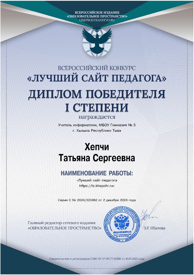 Диплом победителя I степени конкурса «Лучший сайт педагога» сетевого издания «Образовательное пространство»