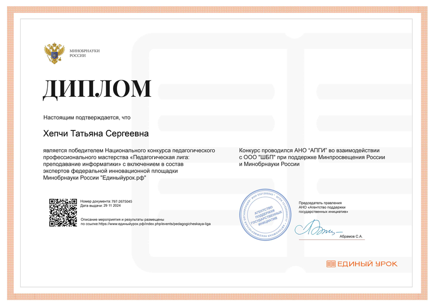 Победитель Национального конкурса педагогического мастерства "Педагогическая лига: преподавание информатики"